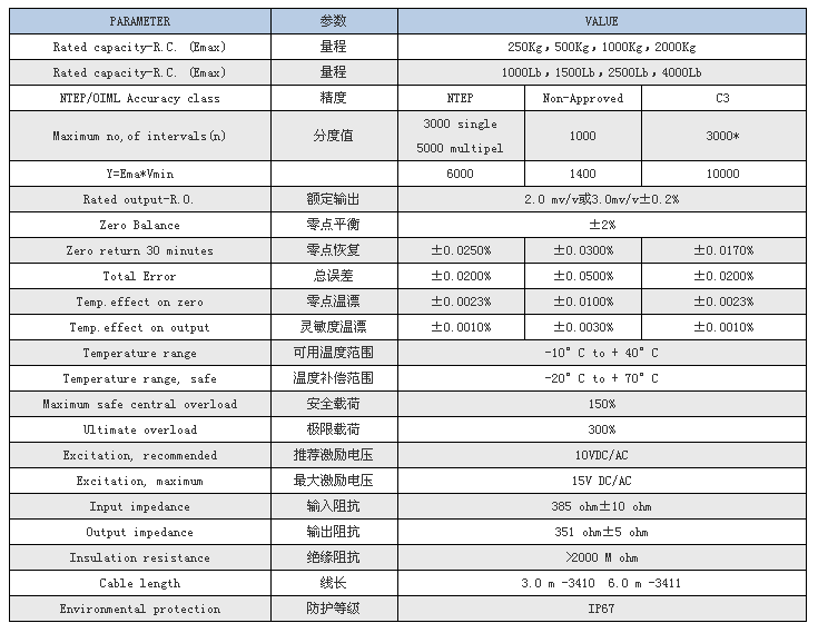 特迪亞3410-2000KG稱(chēng)重傳感器產(chǎn)品參數(shù)表: