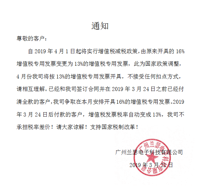 關(guān)于發(fā)票增值稅稅率更改通知函