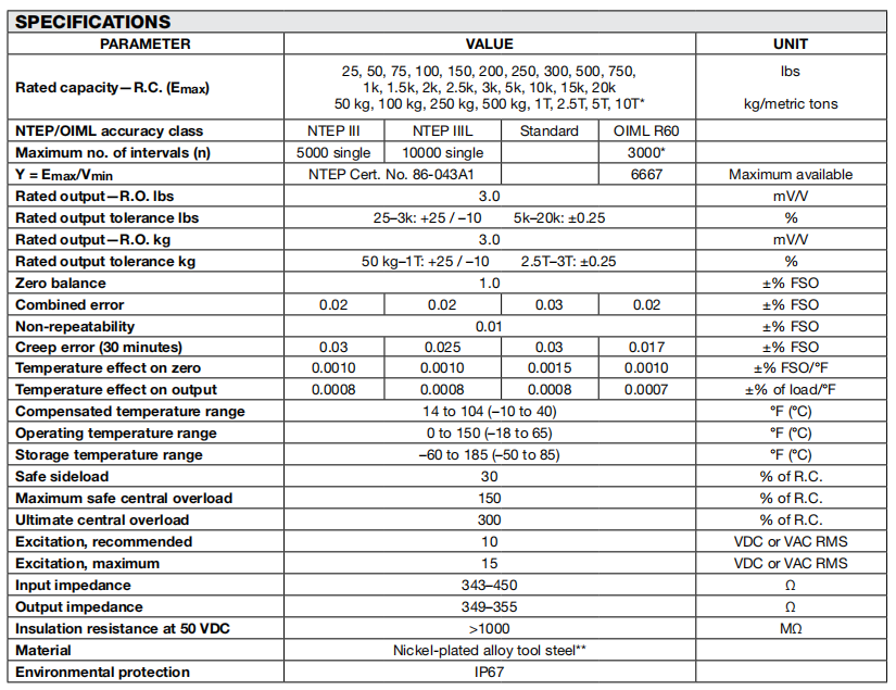 •額定容量為25至20000磅 50公斤至10公噸