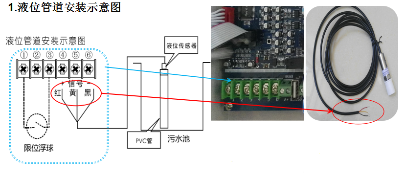 高度防止污泥諸塞,PVC管須固定在水池壁邊,防止晃動(dòng) (注意液位傳感器線顏色及對應(yīng)端口)