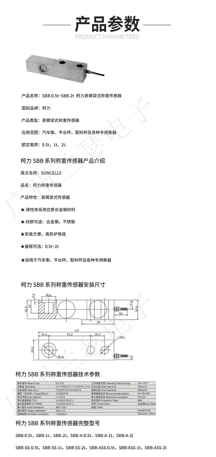 美國SUNCELLS SBB稱重傳感器全部型號: