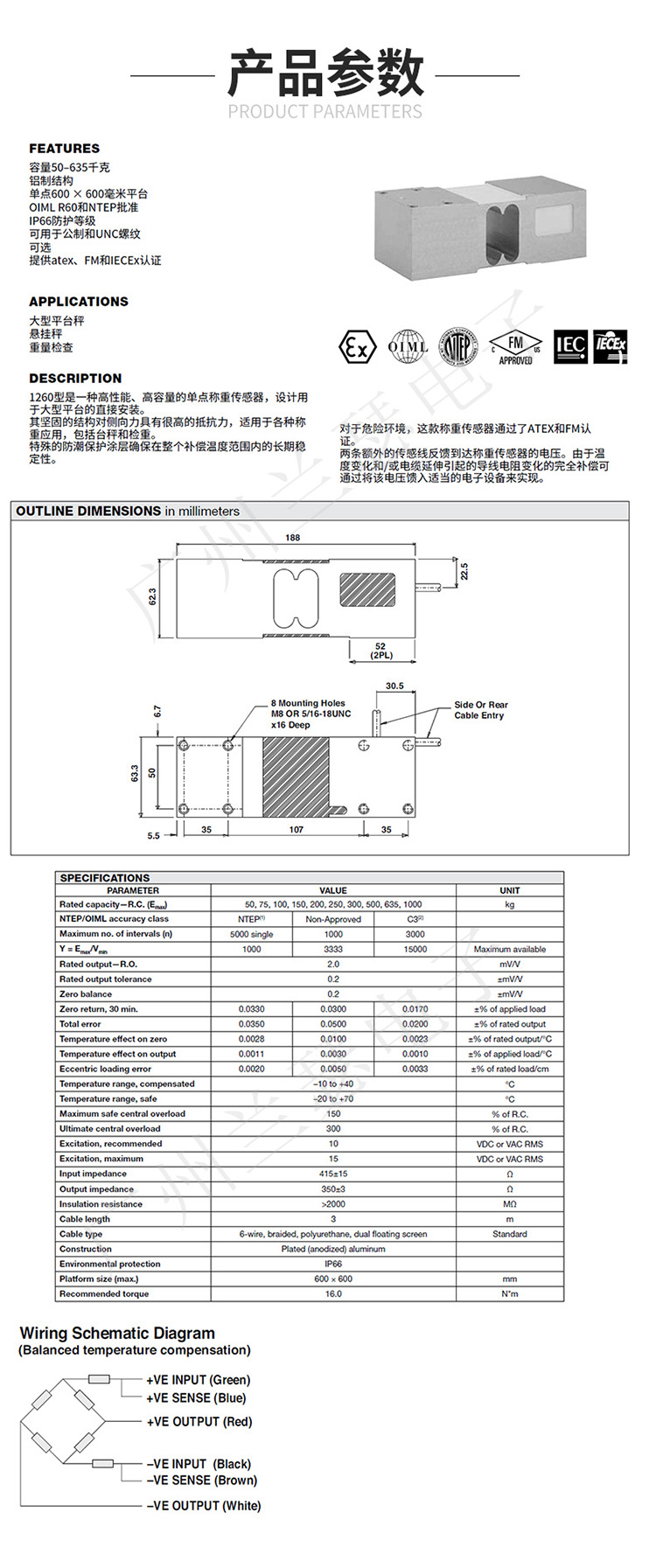 美國Tedea 1260-200kg稱重傳感器產品參數: