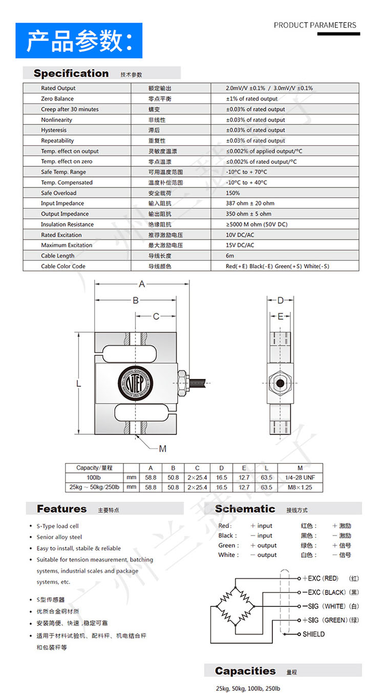 美國傳力BSA-250LB稱重傳感器技術(shù)參數(shù):