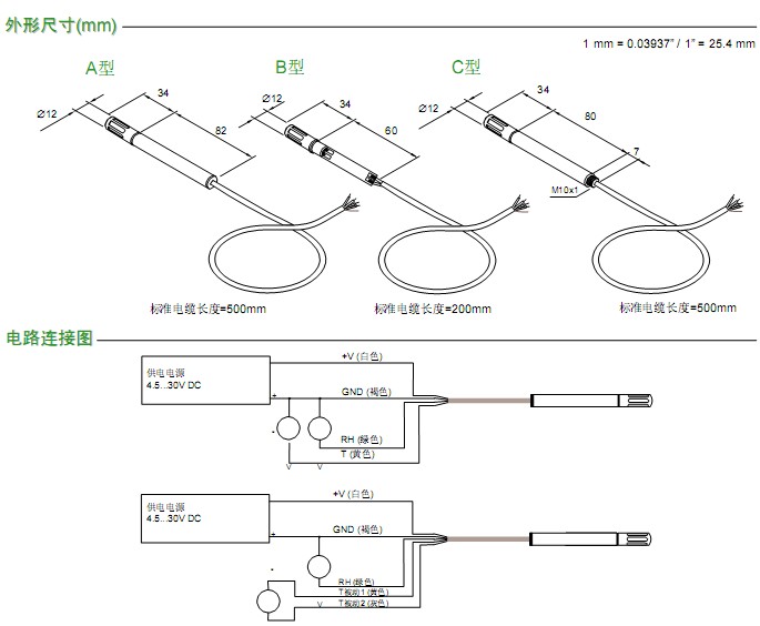 相對濕度和溫度的模擬輸出信號都是0 – 1V。溫度輸出信號可以是主動的,也可以是被動的。