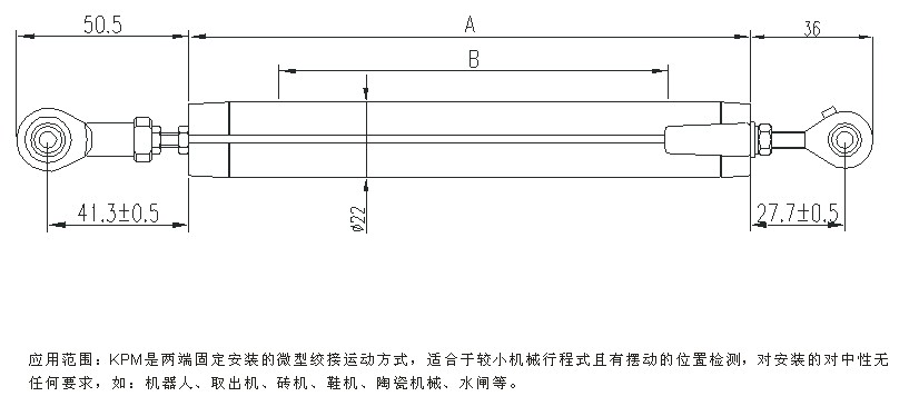 KPM微型絞接電子尺,有效行程75mm~1000mm,兩端均有4mm緩沖行程,精度0.05%~0.04%FS。外殼表面陽極處理,防腐蝕;內(nèi)置導(dǎo)電塑料測量單元,無溫漂,壽命長;具有自動電氣接地功能。KPM微型絞接位移傳感器可適用在大多數(shù)通用場合,特別適用產(chǎn)品本體不能固定,擺動運動的場合,無需對中;允許極限運動速度:垂直安裝時為10m/s,水平安裝時為3m/s。